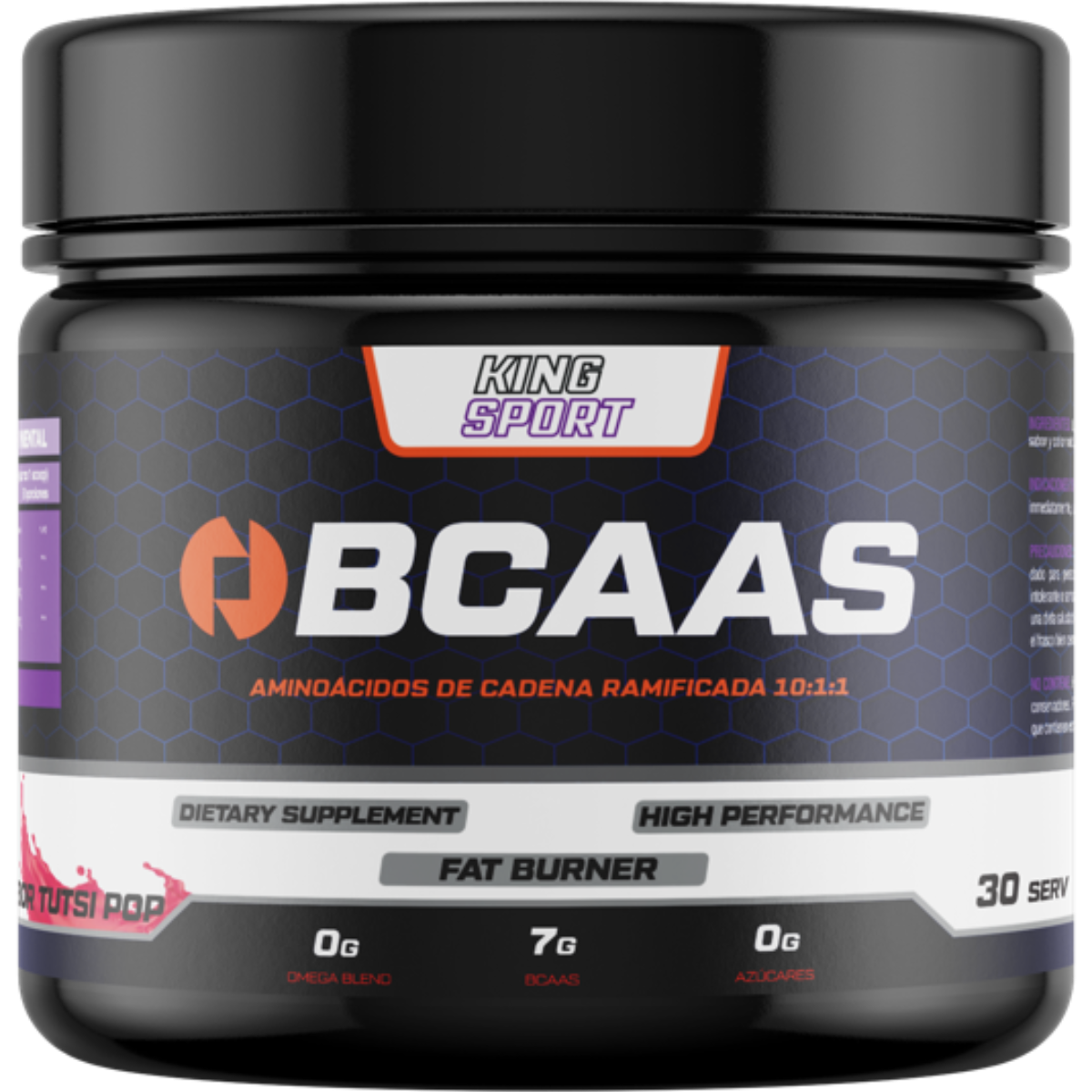 L-Leucina, L-Valina, L-Isoleucina, Sucralosa, sabor y color natural y artificial, dióxico de silicio.